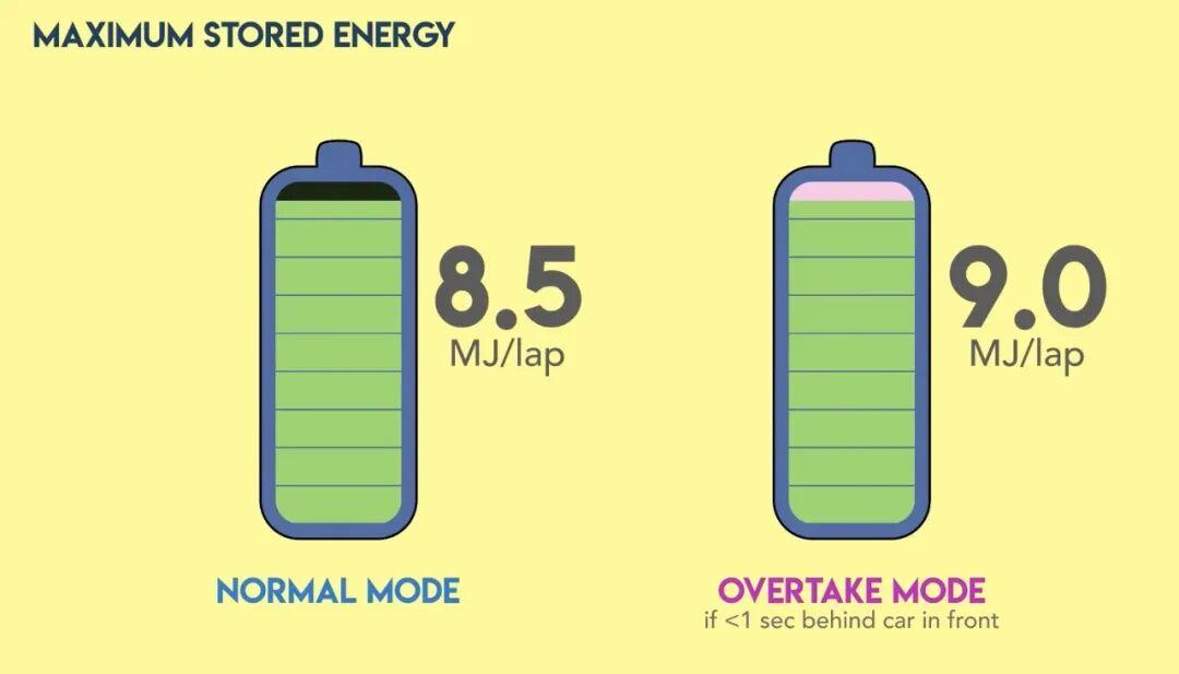 减重:赛车最低重量降低30kg,从798kg减为768kg。竞技与超车规则原有的DRS(可变尾翼系统)将被全新的主动空力系统和超车模式取代。 在新的超车模式(Overtake Mode)下, 当后车在侦测点与前车差距在1秒内时,系统将给予后车额外0.5MJ的电量,从而实现比对手更长的全功率输出时间,增加超车机会(如下图蓝色部分)。 这 0.5MJ 的能量大约相当于额外提供 67匹马力 (约50kW) 的持续爆发力,帮助后车在高速段维持更久的加速状态,直至加速至337 km/h甚至更高)。 而前车的动力输出在现有规则下,当时速达到290km/h时系统自身就会按常规状态逐渐衰减,超车机会就此出现。