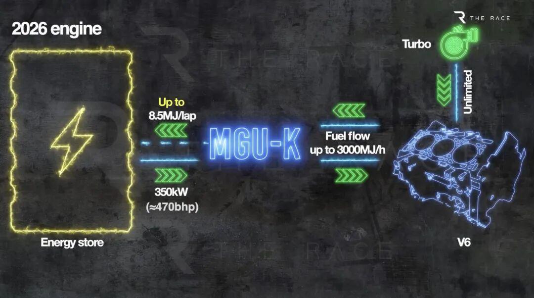 动力单元(Power Unit)动力配比平衡:电能占比大幅提升,1.6T V6内燃机(ICE)功率从550kW降至400kW,而电机(MGU-K)功率从120kW激增至350kW,实现接近 50/50 的油电动力分配。